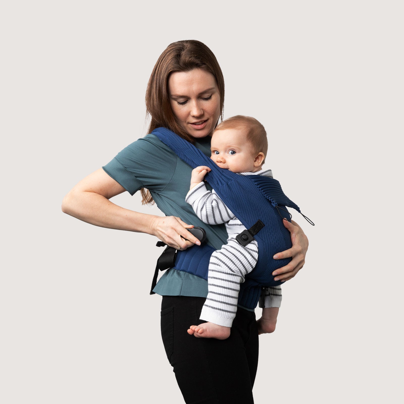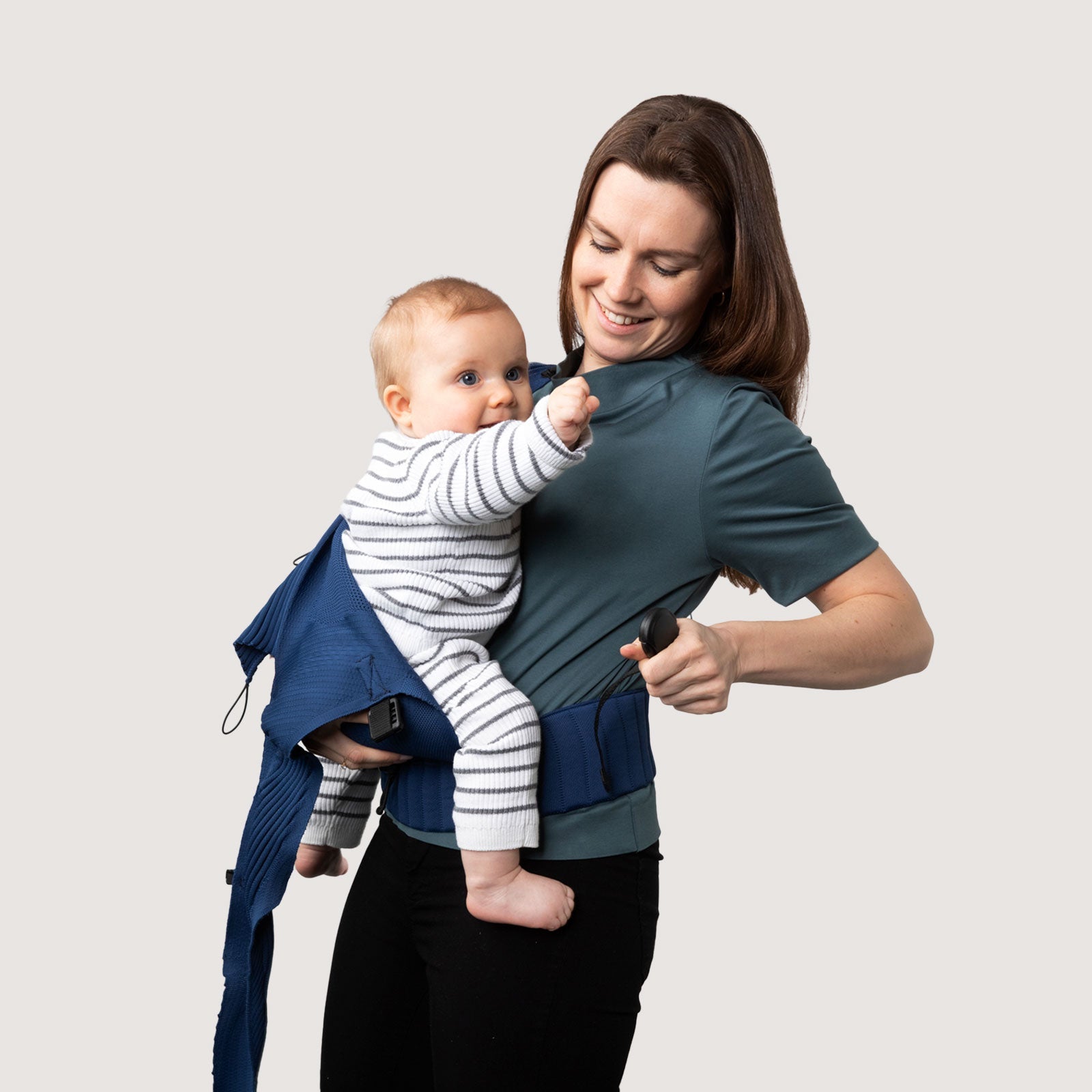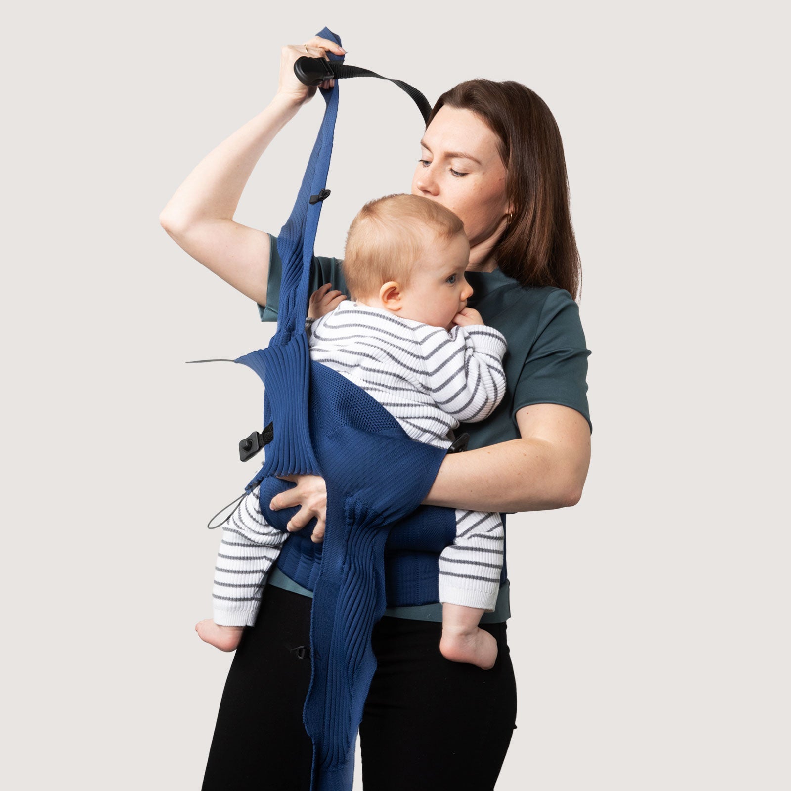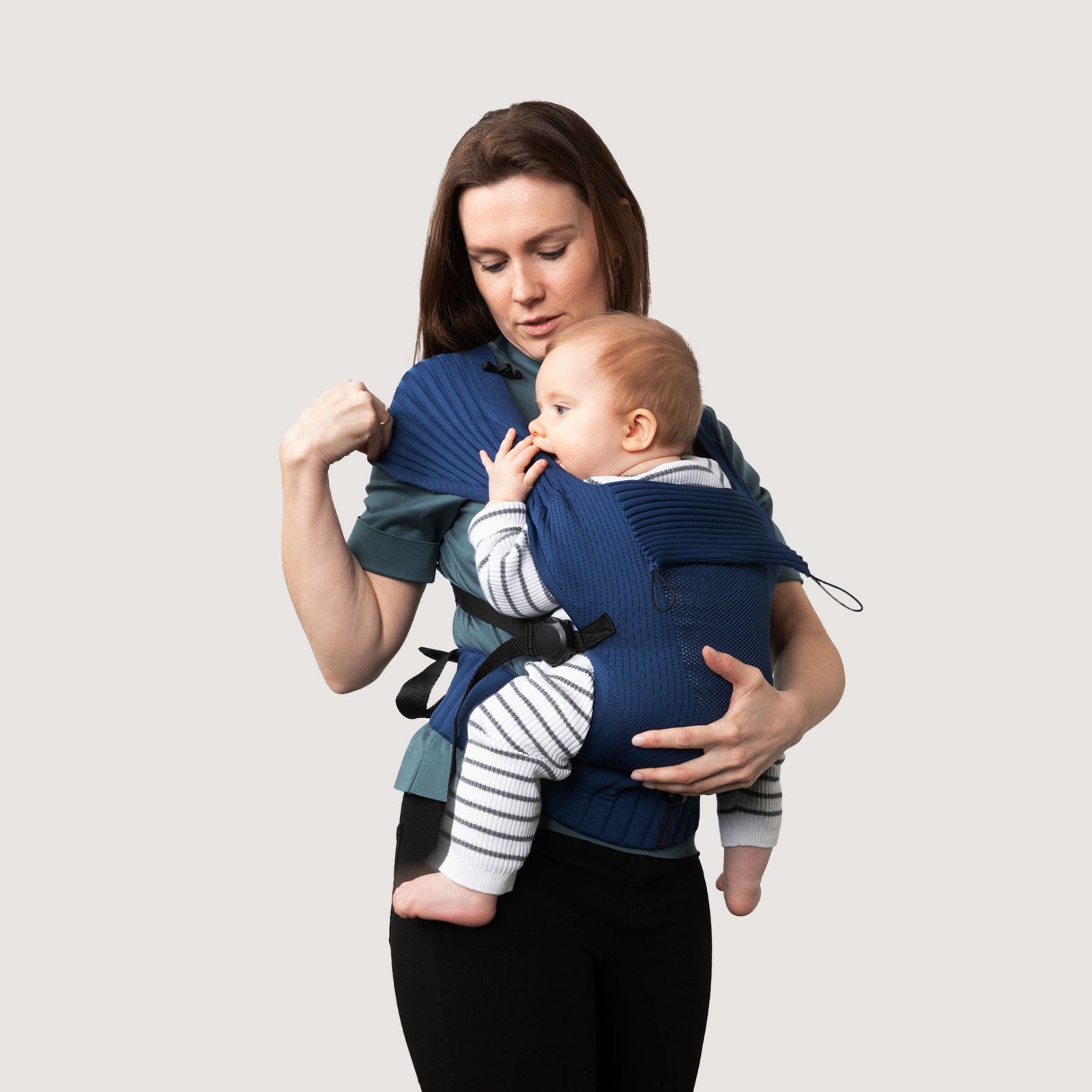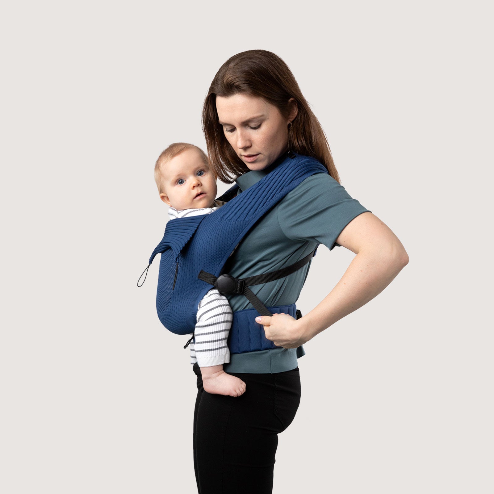 Guide the right shoulder strap diagonally across your back and secure it with the magnetic closure on the left side. One hand always secures your child.